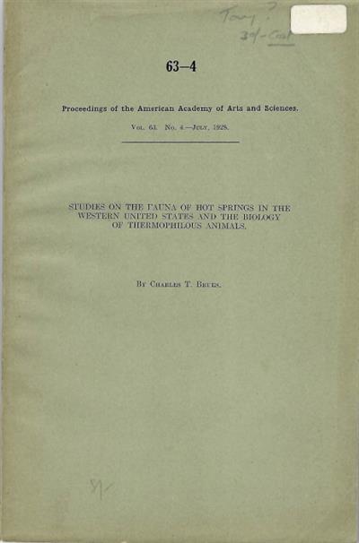 Studies on the fauna of hot springs in the western United States and the biology of thermophilous animals