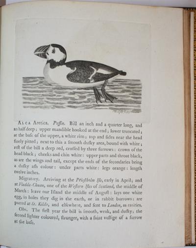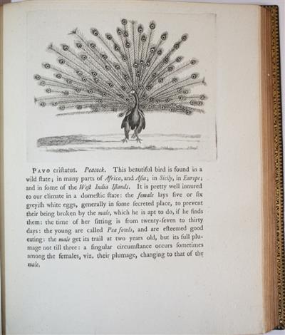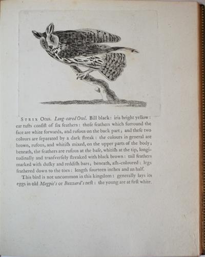 First edition. Unpaginated, printed to recto only, with Title pages, Preface, sectional titles, and charming illustrations, mostly by the author, 'copied from nature', and engraved by P. Mazell. For each of the 255 species there is an etching occupying the top half of the page with letterpress description beneath. Very scarce. 'Edward Donovan, the nineteenth-century naturalist and author, stated that the work was then already scarce when he wished to purchase it (he died in 1837)' (Jackson, Bird Etchings, pp.148-156). A copy held by McGill University library, bears a note quoted from Donovan stating, 'I am credibly informed that no more than twenty-five copies of the work were struck off. The plates were subsequently destroyed. The figures I know to be genuine, and to be in general copies from the birds in the Leverian Museum.' Jackson (op. cit.) states, 'It seems incredible that only twenty-five copies should have been printed. ... It is true, however, that hardly any copies are available in libraries today, and it is extremely difficult to obtain this book on the second-hand market.'