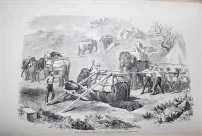 Fo. (450x320mm), orig. pictorial, red cloth bevelled boards, blind-stamped decorative border, with gilt-blocked illustration of an expedition elephant carrying canon to front board, bevelled edges, aeg, recased and recently rebacked in matching cloth, gt title to spine, new endpapers. Small, faint marginal stain to upper, inner corner of final fourteen pages. Cont. gift inscription to flyleaf. A very good copy.