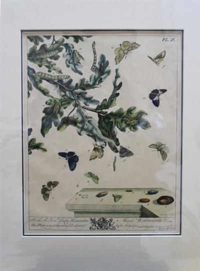 A delightful hand-coloured copper engraving from the rare first edition of The Aurelian, 1766. The plate depicts the 'Purple Hair-Streak' (Quercusia quercus), the 'Silver Lines' (=Green Silver Lines Pseudoips fagana), the 'Pea-Green (=Green Oak Tortrix Tortrix viridana, the 'Dun-Bar' (Cosmia trapezina), and the 'Scalloped Winged Broad Bar' (=Scalloped Hazel Odontopera bidentata) showing the various developmental stages on the common oak (Quercus Latifolia. Foot of image, engraved 'Moses Harris ad Vivum', indicating that the drawing was made from living specimens.