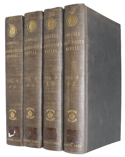 William Thomas Lowndes (c. 1798-1843), was an English bibliographer, known for this classic work, which took him fourteen years to complete. It was one of the first comprehensive bibliographies of Great Britain and Ireland, which includes occasional annotations on the rarity, value, or significance of the works included. It became a key reference tool for book collectors, booksellers, and librarians during the 19th century.