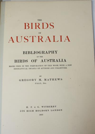 Scarce. Gregory Macalister Mathews (1876-1949) was an Australian-born ornithologist who spent much of his later life in England. His passion for Australian birds led Matthews to publish many key works in the field of Australian ornithology, including the monumental, 'The Birds of Australia' (1910-1927), published in 12 volumes, in an edition of only 225 numbered copies. The work included five supplements. Supplements IV and V being the Bibliography of the Birds of Australia. The Bibliography was also bound separately by the author for presentation and remains a useful reference work. It consists of biographical notices of C. Davies Sherborn and Charles Wallace Richmond with portraits, followed by bibliographical information about key works and biographical notes on authors and collectors.