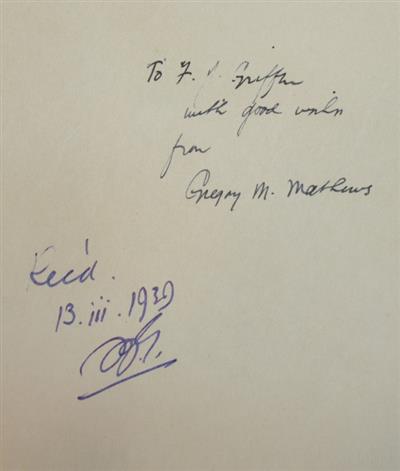4to, orig. cloth, rubbed, minor wear to head/foot of spine. Signed presentation copy from the author to the bibliographer Francis James Griffin (1904-1990), who was a librarian at the Natural History Museum, London and later also Registrar and Librarian of the Entomological Society of London. Date of receipt noted by Griffin. A few ink corrections to the text in Griffin's hand.