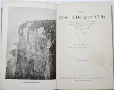 Edward Walter Wade (1864-1937) 'worked as a clerk for the family timber company in Hull and in his spare time visited Bempton Cliffs, where he climbed (routinely without a rope) to observe the seabirds and to collect eggs. He was an active member of the Hull Scientific and Field Naturalists' Club and became one of their Vice-Presidents and President. Between 1902 and 1920 he was a member of the British Ornithologists' Union. Wade's published comments on guillemots and their pyriform-shaped eggs, at Bempton, were unusually insightful, in part because his observations were made at close range (a consequence of his climbing ability), and partly because he thought carefully about what he saw. Wade was among the first to point out that the spinning-like-a-top explanation for the guillemot's pyriform egg shape was incorrect based on his own observations.' (Birkhead & Thompson, 2019, Archives of Natural History 46: 240-252.)