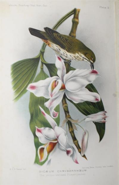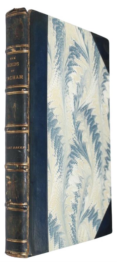 Parts I-[XII], extracted from the Journal of the Bombay Natural History Society (Vol. VIII-XIII), with a printed title page, 'The Birds of Cachar'. Also bound following part II is, 'Notes on a new species of wren found in North Cachar, Assam', (4pp, 1 col plate, 1892). Ten attractive chromolithographic plates by the author, printed by Mintern Bros.