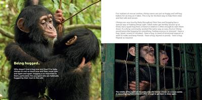 Part 2 - Being helped to be a Chimp - covers the vastly different life of rehabilitating chimps at rescue centres and what they go through learning to be chimps all over again. Spreads include being rescued, being seen by the vet, being supported, being bottle-fed, being encouraged, being happy and so on.