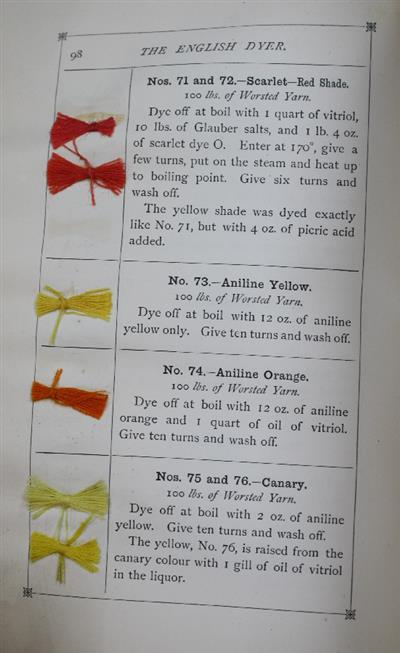 The English Dyer: with instructions showing how to dye 150 shades on cotton yarns in the hank; 50 shades on cotton wool; 150 shades on worsted yarns; 100 shades on animal wool; and 50 shades on silk in the skein.