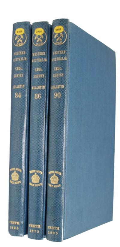 Bulletin Geological Survey Western Australia Nos 84, 86, 90. A fascinating set of bulletins in which the author details his geological surveys of Western Australia. Includes historical notes from the 1860's onward. The scale of the work is amazing, (Bulletin no.84) was the result of two years work, a reconnaissance survey ‘being 12,100 miles in extent’. Illustrated with large colour folding maps. Edward de Courcy Clarke (1880-1956), was a New Zealander, who joined the Geological Survey of Western Australia, from 1912 to 1920. Clarke is known for conducting extensive field work in challenging areas of Western Australia, the results being published later in Bulletins of the Geological Survey of Western Australia. He was appointed Lecturer-in-charge, Department of Geology, University of Western Australia, retiring as Professor in 1948. The Edward de Courcy Clarke Earth Science Museum, at the University of Western Australia is named after him.