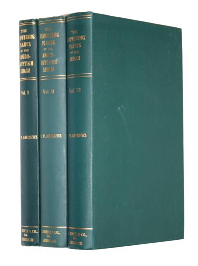 1st edition. Complete in three volumes. Vol. I: Cycadaceae - Tiliaceae; Vol. II: Sterculiaceae - Dipsacaceae; Vol. III: Compositae - Gramineae. Volume III title reads 'The Flowering Plants of the Sudan'. Frodin, D.G, Guide to Standard Floras of the World, 2001 states that this work is most useful in the central and northern parts of Sudan, i.e., the Khartoum district and Nubia.
