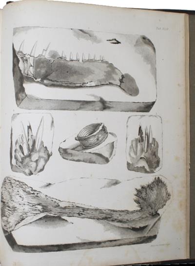First edition. Plates engraved by Mrs. Mantell from drawings by the author. Gideon Algernon Mantell (1790-1852) was an English physician and geologist. This is Mantell's first work, and contains his early research into the fossil remains of the South Downs in southern England. Arranged by rock type and strata, Mantell provides descriptions of fossil plants, fish, molluscs and the teeth of what appeared to be a gigantic reptile, 'an animal of the lizard tribe, of enormous magnitude'. This volume was the first published work to describe a collection of dinosaur remains. Mantell's subsequent work on these remains was the origin of the scientific study of dinosaurs.