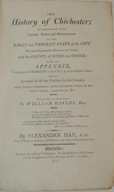 'With an Appendix, Containing the Charters of the City, at three different Time; Also an Account of all the Parishes in the County, their Names, Patronage, Appropriations, Value in the King's Books, First-Fruits, &c. Dedicated, by Permission, to William Hayley, Esqr.' First edition.