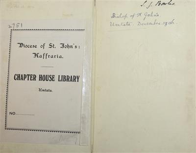 8vo, orig. cloth, blind-stamped dec. to boards and spine, gilt title to spine and front board; spine faded, top of front joint worn, corners lightly bumped. Occasional light spotting. Short pencil annotation to rear endpaper. Owner's name to front endpaper also inscribed 'Bishop of St. John's, Umtata. December 1906'. Vg. Blind stamp and bookplate of the "Diocese of St. John's: Kaffraria. Chapter House Library, Umtata" (Modern Mthatha, South Africa).