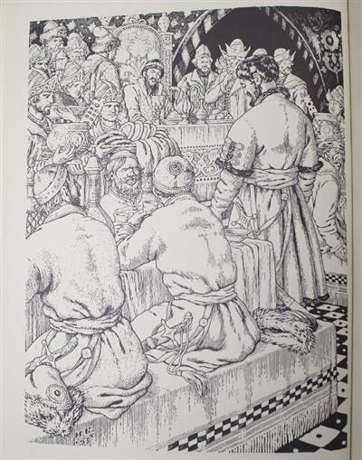 Translated from the Russian by Irina Zheleznova. Charming illustrations by Ivan Bilibin. Title page printed in red and black, with head and tail pieces and drop capitals also printed in red throughout the text. First published in English translation in 1976 (Progress Publishers); this illustrated edition 1983.