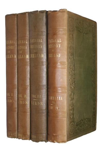 First edition. Scarce. Vol I: Birds, Raptores & Insessores; Vol II: Birds, Rassores & Grallatores; Vol III: Birds, Natatores; Vol IV: Mammalia, Reptiles, and Fishes, also Invertebrata. One of the first major works on Irish natural history. The first three volumes (published by Reeve) cover the ornithology of Ireland, with the final volume, published posthumously and edited by Robert Patterson, George Dickie, and Robert Ball, (published by Henry Bohn), covering mammals, reptiles, fishes, and invertebrates. The latter also includes a portrait and Memoir of William Thompson. Printed list announcing other publications available from Reeve & Benham loosely inserted in Vol. III. Publisher's advertisements to the rear of Vol. I, II & III (dated Jan. 1849, Dec. 1849 & March 1851, respectively).