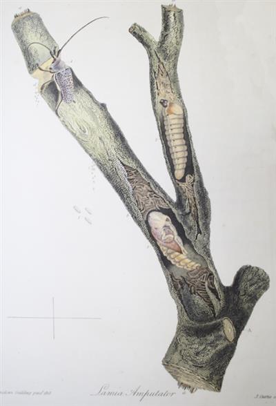 Fine hand col plate showing the life stages is drawn by the author and engraved by the entomologist and illustrator John Curtis (1791-1862).