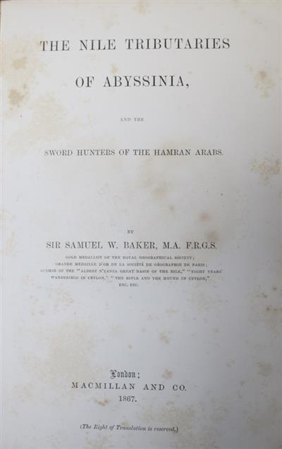 Sir Samuel White Baker (1821-1893) was a British explorer, soldier, big game hunter and author. This famous work, complements Baker’s earlier book The Albert Ny'anza, Great Basin of the Nile. In The Nile Tributaries of Abyssinia, Baker describes the fourteen months he spent exploring the tributaries of the Nile (1861-1862), including the Atbara, Settite, Dinder rivers. During these extraordinary travels he was accompanied by his wife Florence (1841-1916). Baker was able to show that the rich sediment of the Nile originated from these rivers.