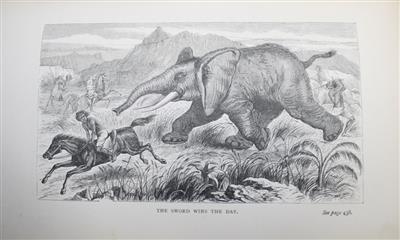 He hunted big game including, buffalo, giraffe, elephant, lion and hippopotamus. He spent some time with the Hamran Arabs of Northern Abyssinia, where he recounts witnessing them hunting elephants with swords (which is illustrated in the vignette to front cover and plate facing p. 438). He then explored the river Rehad to its confluence with the Blue Nile, travelling on to Khartoum.