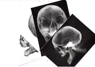 Reprint from Recusant History Vol. 16. Paper discussing the identity of a human skull at Wardley Hall, Salford, in Greater Manchester as that of the martyr, Ambrose Edward Barlow (1585-1641). Enclosed is a letter from the author, Joseph E. Bamber (d. 1983), to anatomist, Prof. A.J. Cave, who had a shared interest investigating the remains of Catholic martyrs. Also included is a set of 7 b/w photographs (2 of X-rays) (2 copies of each, 14 in total), of the skull of Bl. Miles Gerard (d.1590), sent by Prof Cave to Bamber.