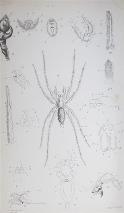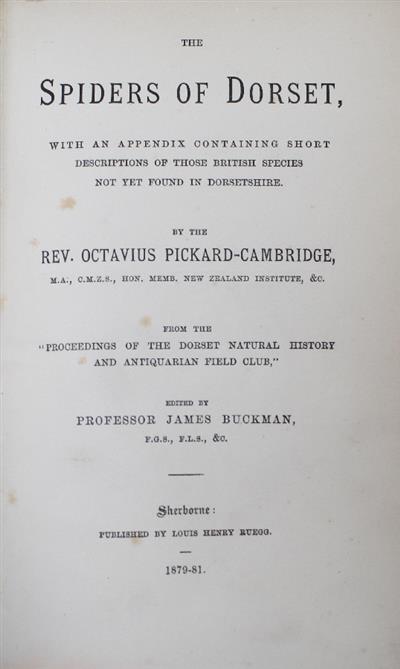 2 vols, 8vo, cont. half-morocco, rubbed/scuffed, raised bands to spines; occasional light foxing. Very good. Also included is an offprint by Pickard-Cambridge, 'On New and Rare British Arachnids noted and observed in 1913', from Proceedings Dorset Natural History and Antiquarian Field Club, Vol. XXXV: 119-142, 1 plate (1914), orig. printed wrappers, inscribed 'F.J. Palmer Esq. With Author's kind regards'.