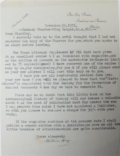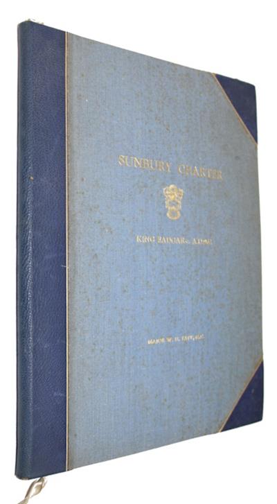4to (260x208mm), orig. blue half morocco, some foxing/spotting to cloth boards, gilt title to front board. Vg. Loosely inserted are two signed letters from the author to a Mr. Blankley, a resident of Sunbury, who is mentioned in the work as having brought the author's attention to an earthwork in his back garden that corresponds with the "Cloven Barrow", a series of neolithic barrows mentioned in the charter as part of the eastern boundary. Also loosely inserted is a newspaper cutting from the Middlesex Chronicle (Jan. 12th, 1951) titled "The Boundaries of Sunnanbyrig", also based on Tapp's study of the charter.
