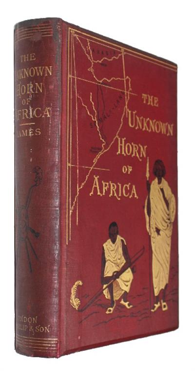 First edition. An account of the author's travels in unexplored Somaliland (East Africa). James was killed by an elephant in West Africa in 1890. Nine un-numbered plates illustrate landscapes and native people, 10 lithographs printed by Hahnhart are of fauna (plate I-IX + one un-numbered: including 5 of birds by J.G. Keulemans, 3 of mammals by J. Smit, 1 (tinted) of the naked mole rat and 1 of butterflies by J. Macfarlane) and four by M. Smith, printed by Vincent Brooks Day & Son of flora (plate 1-4). Also issued with 10 of the lithographs hand-coloured, but this is an uncoloured copy. Includes several Appendices on the specimens of flora and fauna collected, by various authors (Lepidoptera by A.G. Butler; Mammals by F.L. Sclater; Rodents by Oldfield Thomas; Birds by G.E. Shelley; A new species of Barbet by G. Hartlaub; Flora of Somali-land by Prof. Oliver).