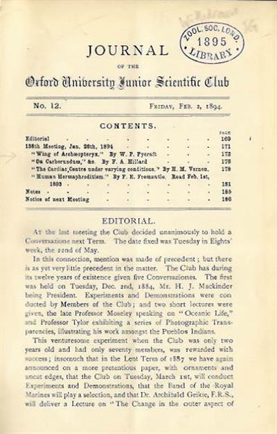 In The Journal of the Oxford University Junior Science Club No. 12: 172-176. This issue (pp. 169-186), also includes 'On carborundum and other substances prepared by means of the elecrtic arc' by F.A. Hillard, 'The Cardiac Centre under varying conditions' by H.M. Vernon, and 'Human Hermaphroditism' by F.E. Fremantle.