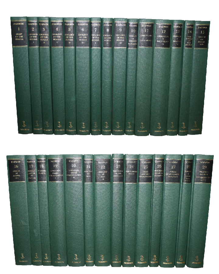Pickering Masters edition, complete in 29 volumes.Pickering Masters edition, complete in 29 volumes. Introduction by Paul Barrett, which explains that ‘The selection of the particular edition of the books published in Darwin's life-time which are included in this collection, was based on the concept of a 'definitive' text. Both the First and Sixth edition (eighteenth thousand, 1876) of On the Origin of Species are included, since both represent definitive versions'. Also included are several posthumously publications. A brief introduction is given to each work.