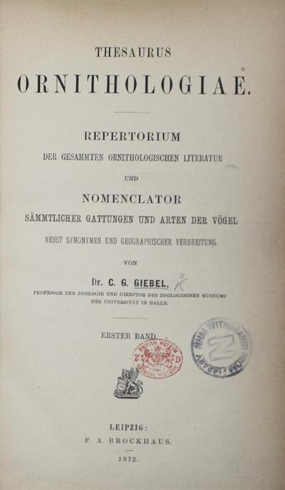 Thesaurus Ornithologiae. Repertorium der gesammten ornithologischen Literatur und Nomeclator sämmtlicher Gattungen und Arten der Vögel nebst Synonymen und geographischer Verbreitung. Bd I-III