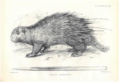 Attractive plain lithographic plate by Philibert Charles Berjeau (1845-1927), printed by Mintern Bros., 190x160mm. From Proc. Zoo. Soc. London. The thick-spined porcupine (Hystrix crassispinis) is a species of rodent endemic to the island of Borneo, also and found in Brunei, Indonesia, and Malaysia.
