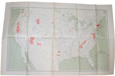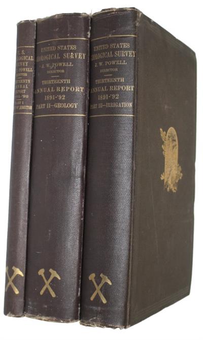 Volume complete in three parts. Part 1: Report of the Director. Includes two large folding maps in rear pocket; Topographic progress map and Geologic progress map. Part II: includes articles; Second Expedition to Mount St. Elias [Alaska] by I.C. Russell; The Geological History of Harbors by N. S. Shaler; The Mechanics of Appalachian Structure by B. Willis; The Average Elevation of the United States by H. Gannett; The Rensselaer Grit Plateau in New York by T. N. Dale; The American Tertiary Aphidae by S. H. Scudder. Includes a large colour folded map ‘Map showing altitudes in the United States’ in rear pocket. Part III, Irrigation, includes articles; Water Supply for Irrigation by F.H. Newell; American Irrigation Engineering by H.M. Wilson; Engineering Results of Irrigation Survey by H.M. Wilson; Report upon the Construction of Topographic Maps and the Selection and Survey of Reservoir Sites in the Hydrographic Basin of the Arkansas River, Colorado by A.H. Thompson; Report upon the Location and Survey of Reservoir Sites during the Fiscal Year ending June 30th 1892 by A.H. Thompson The United States Geological Survey was established by an act of Congress in 1879 and was charged with the 'classification of the public lands and examination of the geological structure, mineral resources, and products of the national domain'. The Thirteenth Annual Report was produced by John Wesley Powell (1834-1902) who served as the second director of the U.S. Geological Survey, 1881–1894. The three volumes contain a series of important papers, accompanied with fascinating black and white photographs, illustrations and maps.