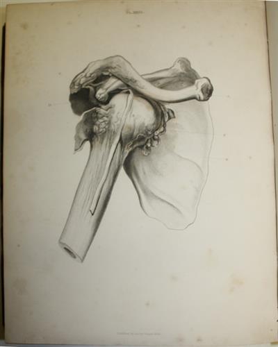 Sir Astley Cooper (1768-1841) was a pre-eminent London surgeon, professor of comparative anatomy at the Royal College of Surgeons from 1813-1815, vice-president of the Royal Society, a member of the court of examiners of the college in 1822, where he served as president twice, in 1827 and 1836, and author of a number of influential medical works. In his published works, he paid particular attention to high-quality illustrations, drawn by a succession of artists that he himself employed. (ODNB). Sir d'Arcy Power, referred to this important work in his paper, 'Epoch-Making Books in British Surgery', British Journal of Surgery Vol. 17 (1930) stating that 'Sir Astley Cooper's Treatise on Dislocations and Fractures of the Joints was the English classic until the American surgeons introduced manipulation in place of pulleys and until the whole subject was revolutionized, first by the discovery of X-rays and afterwards by the enormous experience gained during the European War. The book, a large quarto.… first appeared in 1822, and is dedicated in a grateful preface to the students of St. Thomas’s and Guy’s Hospitals. It ran through ten editions and was published at the price, of £1 11s. 6d. It is still worth reading, partly for the detailed accounts of the cases it contains and partly because it recalls the difficulties which surgeons experienced at a time when anæsthesia was unknown.'