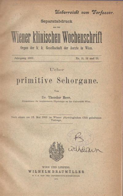 Text German. About primitive organs of vision. Offprint from Wiener klinischen Wochenschrift 1901, Nr. 11, 12 und 13