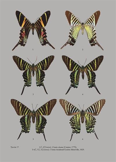 Text Italian. Colour photographs of many species of Castniidae and Uraniidae. A selection of the most interesting and rare moths from Vinciguerra's collection. 80 color plates illustrating 80 specimens of Uraniidae, 175 specimens of Castniidae and 68 specimens of Saturniidae.