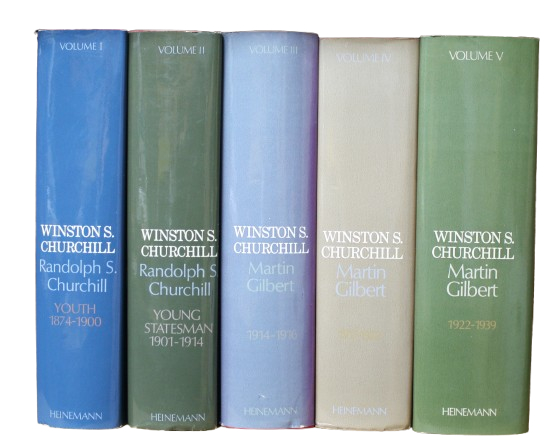 Five (of eight) volumes. Vol. 1-2 by Churchill's son, Randolph Churchill (1911-1968) the remaining volumes completed after his death by British historian Martin John Gilbert (1936-2015). Vol. 1: Youth, 1874-1900 (1966). Vol. 2: Young Statesman, 1901-1914 (1967). Vol. 3: The Challenge of War, 1914-1916 (1971). Vol. 4: 1916-1922 (1975). Vol. 5: 1922-1939 (1976).