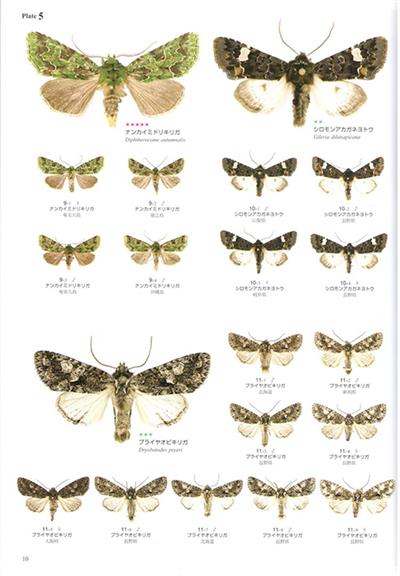 Text Japanese, with Latin scientific names. The Japanese Winter noctuid moths (Noctuidae) are illustrated in colour (103 species, 807 specimens) with enlarged photos of all included taxa and showing the variation of each taxon in natural size. Related species (e.g. Xylena spp., Conistra spp., Orthosia spp. ) are figured on black and white plates. Rarity is indicated by a seven-star rating.