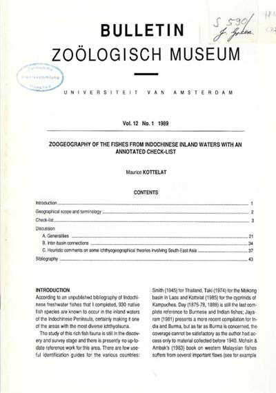 Text English. Bulletin Zoölogisch Museum, Universiteit Van Amsterdam Vol.12 (1). Concerns the fish fauna of the Malay Peninsula and Thailand.